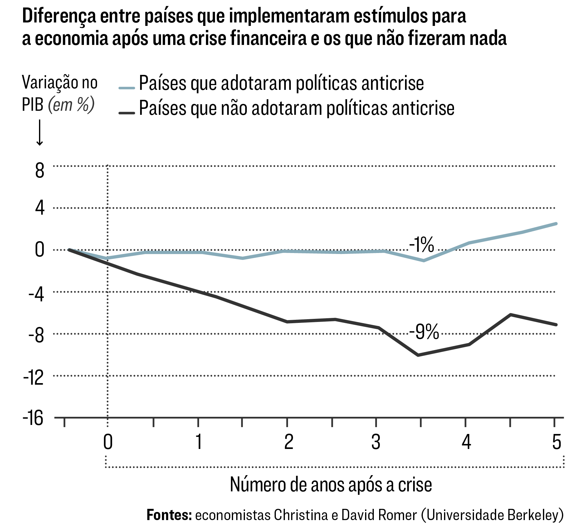 A grande recessão econômica de 2008 levou boa parte dos países ocidentais à bancarrota praticamente ao mesmo tempo. Agora, para sair dela, cada um teve um ritmo diferente. Um exemplo positivo é a Islândia: depois de contrair incríveis 39% em 2008, o PIB do país voltou a crescer já no ano seguinte e hoje está prestes a recuperar o patamar pré-crise. Por outro lado, a Grécia acumulou perdas consecutivas e hoje tem uma economia 45% inferior à de dez anos atrás. O que está por trás do descompasso na recuperação de economias afetadas por choques idênticos? Para os economistas Christina Romer e David Romer (sim, eles são casados), do campus de Berkeley da Universidade da Califórnia, nos Estados Unidos, o segredo está na capacidade do governo de implantar políticas anticrise. Segundo os pesquisadores, isso acontece quando a dívida pública é menor do que o PIB e a taxa de juro real supera 1,25% — o que dá margem de manobra para baixá-la e aquecer a economia.