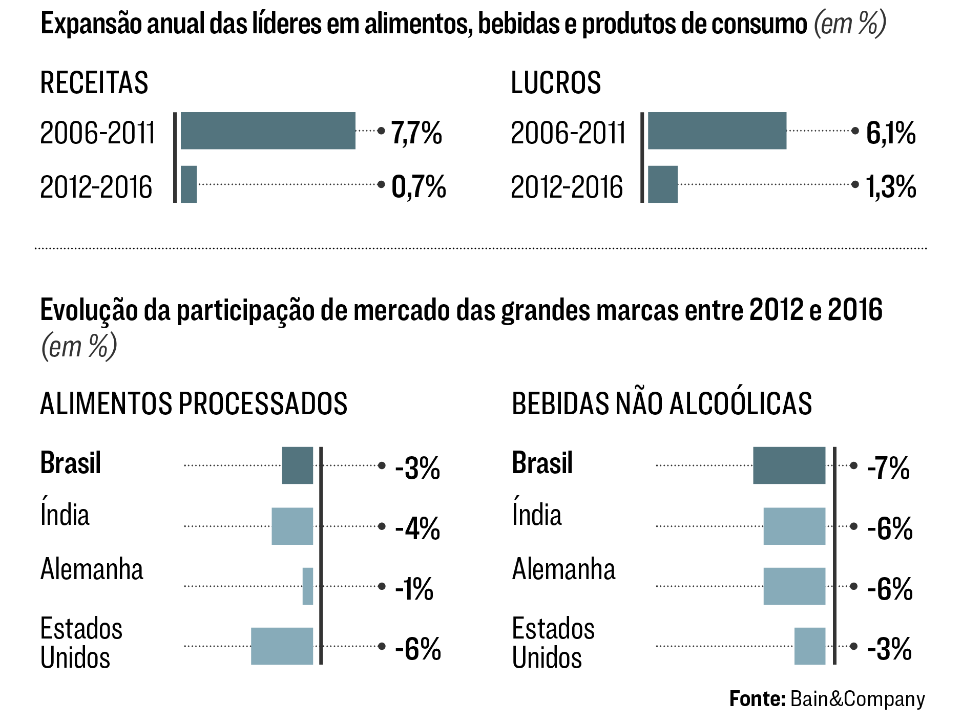 A vida não está fácil para as grandes fabricantes de alimentos, bebidas e produtos de consumo no mundo inteiro. É o que mostra um estudo inédito da consultoria Bain&Company com as marcas líderes nesses mercados em oito países. As receitas estão subindo menos do que antigamente. De 2006 a 2011, a expansão foi de 7,7%. Nos quatro anos seguintes, de 0,7%. A expansão nos lucros também arrefeceu: de 6% para 1,3%. O motivo: as líderes estão perdendo espaço para concorrentes menores. No Brasil, houve queda de 3 pontos percentuais em alimentos e de 7 pontos em bebidas. Na origem da má fase estão o interesse crescente por produtos orgânicos e a expansão do varejo eletrônico, mais fragmentado do que o convencional.