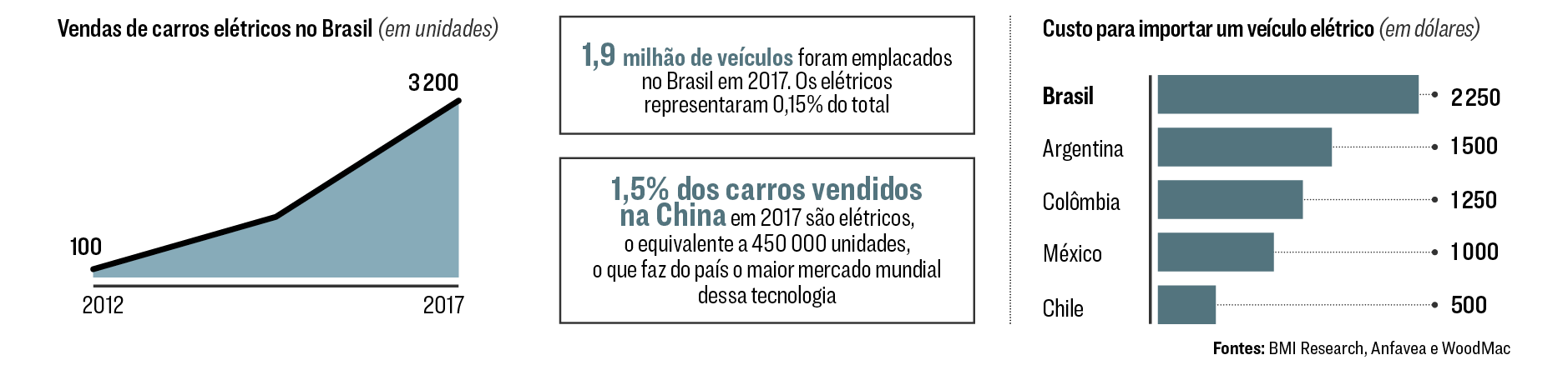 A venda de carros elétricos no Brasil superou 3.200 unidades em 2017, segundo dados da consultoria BMI Research. É o triplo do que foi emplacado em 2016, mas ainda uma pequena fração do comércio total de veículos: 0,15%. É também pouco em relação à China, hoje o maior mercado de carros elétricos do mundo. No ano passado, 1,5% dos carros vendidos no -país asiático tinham esse tipo de tecnologia — o equivalente a 450.000 unidades. Há motivos para acreditar que esse mercado poderá aumentar no Brasil com a aprovação do Rota 2030, programa do governo federal de estímulo à indústria automobilística, que prevê abatimento de impostos desses veículos. Por ora, o custo para importar carros elétricos, que não são produzidos em larga escala no Brasil, é alto: em média, 2.250 dólares por veículo, 50% mais do que na Argentina e 350% do que no Chile.