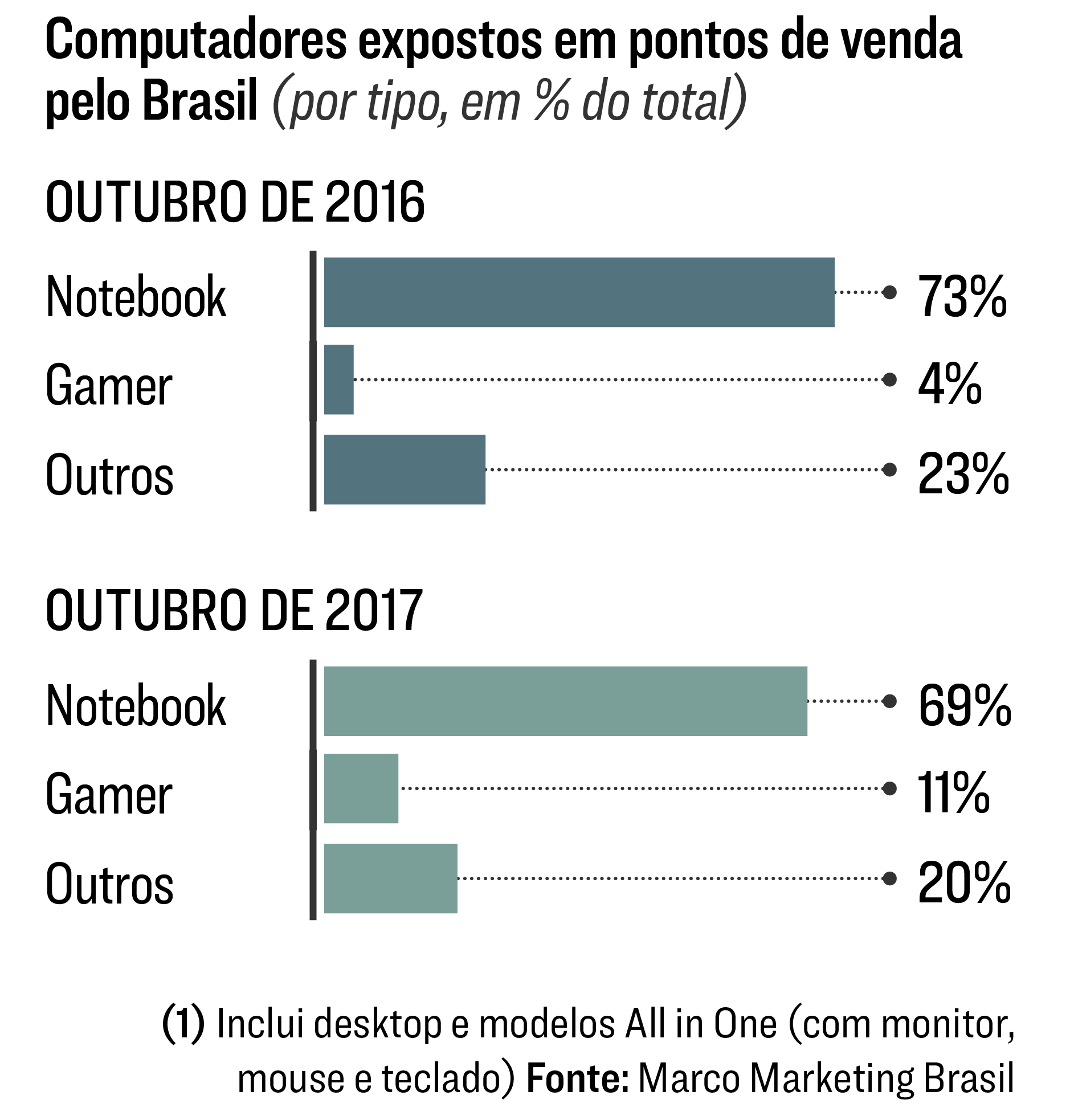 O rápido avanço tecnológico, que barateou os aparelhos, aliado à recuperação da economia brasileira, vem mudando esse quadro. Hoje, os gamers são o produto mais promissor do mercado de computadores. Em outubro de 2017, eles representaram 11% dos computadores expostos em lojas brasileiras, físicas e virtuais. Um ano antes eram apenas 4%, segundo dados da Marco Marketing, consultoria que avaliou 1.000 pontos de venda em 20 estados do país.