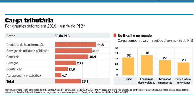 Entre os grandes setores, a indústria de transformação é a que arca com maior carga tributária. O setor pagou em tributos o equivalente a 44,8% do PIB do setor em 2016, enquanto no comércio essa fatia é de 36,4% e nos serviços, de 23,1%. A carga da indústria, porém, caiu em relação a 2015, quando o percentual foi de 45,7%. O levantamento foi feito pela Federação das Indústrias do Estado do Rio de Janeiro (Firjan), com base em dados da Receita e do IBGE.