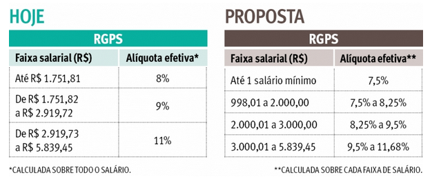 A proposta unifica as alíquotas de contribuição à Previdência dos trabalhadores da iniciativa privada (RGPS) e dos servidores públicos (RPPS). (ver tabelas). Por trás da mudança, está a ideia do governo de fazer com que “quem ganhe mais pague mais”.