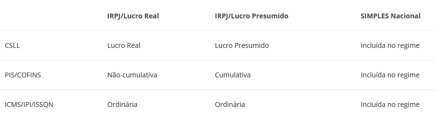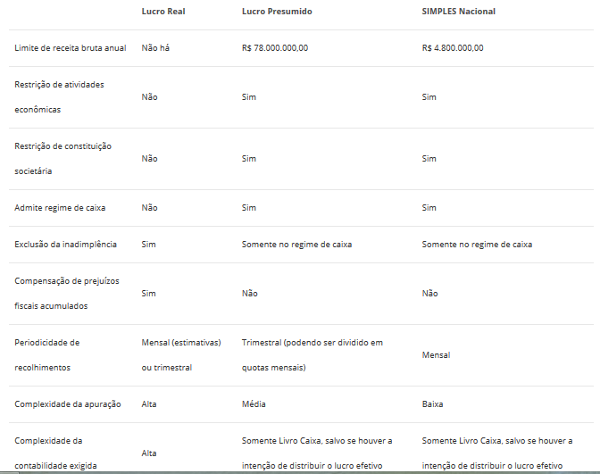 Quadro-resumo: diferenças entre cada regime de tributação